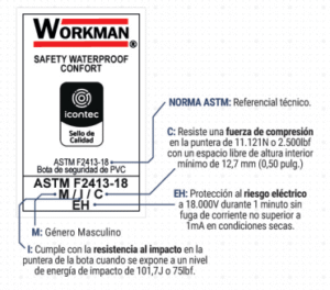 Las botas de seguridad de PVC Workman Safety Waterproof Confort con puntera, están certificadas por Icontec con sello de producto bajo los requerimientos de la norma ASTM F2413-18.